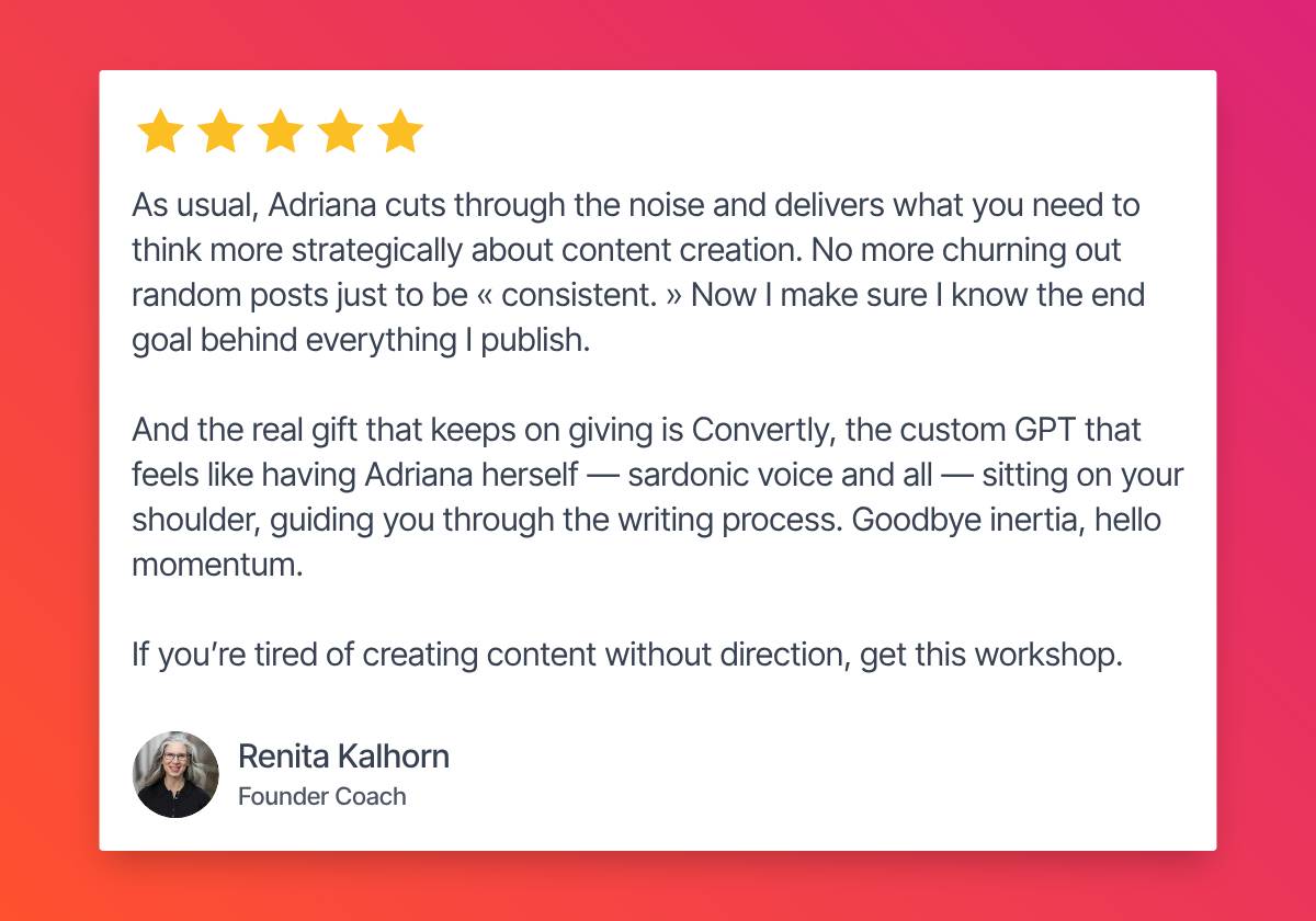 Let the answers sit. Then pick the first asset you’ll build in Q1 and write it in your calendar like an actual task — so it gets done. If you want help turning all this into an actual strategyThe Profitable Content Engine is THE masterclass that will prevent you from spending ages on random acts of content. You’ll get the framework that gets you paid for every piece of content you put out there. And, if the masterclass isn’t enough, Convertly Lab, the custom GPT it comes with, uses psychology and copywriting principles to tie everything you produce to actual, tangible business goals. Just like it happened for Renita and dozens of other clients: Get instant access!🎙️ My podcasts, interviews, and moreHow’s your 2026 content system looking? All done, or does it need some more work? On December 10th, I’m going live with brillian marketer Vassilena Vachalova to talk content systems for 2026 and how to translate business goals into content goals that actually map to revenue. It’s a free livestream that you can join here. ______________________________________________________________ Quick question: have you met all your 2025 goals? Think you’ll meet them by the end of the year?